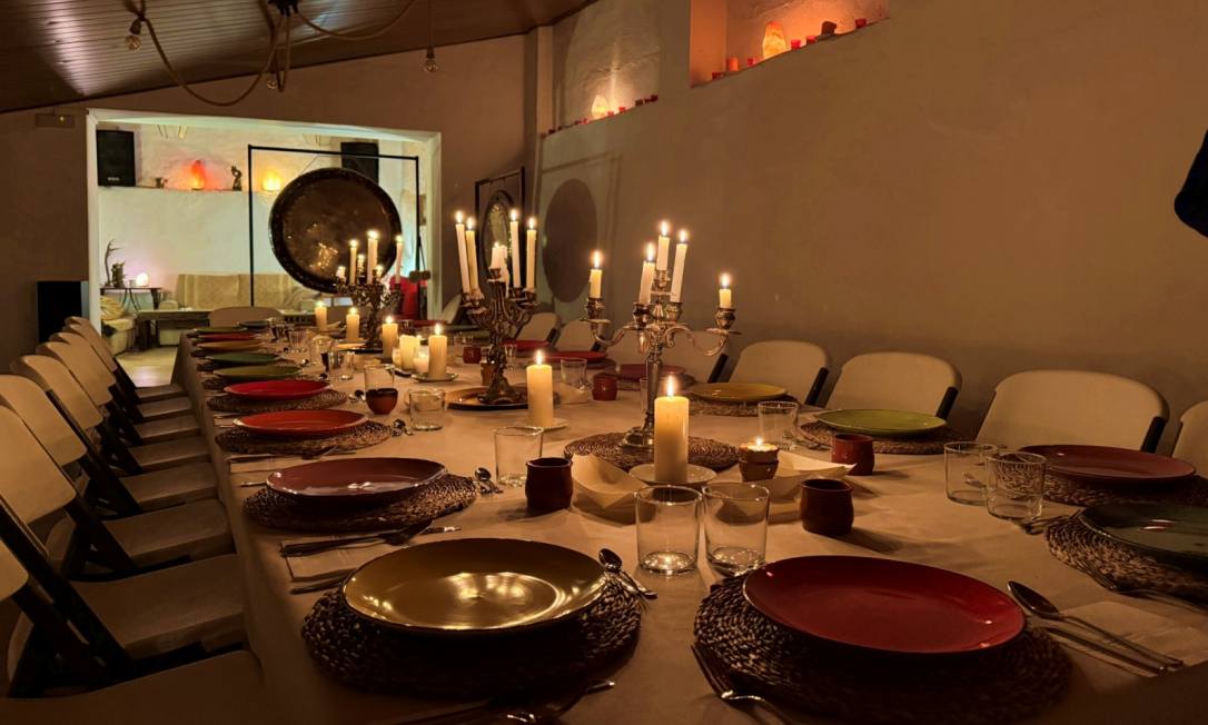La cena sensorial se celebra en la sala de meditación de la Hospedería, iluminada con velas y preparada para un viaje íntimo y profundo.